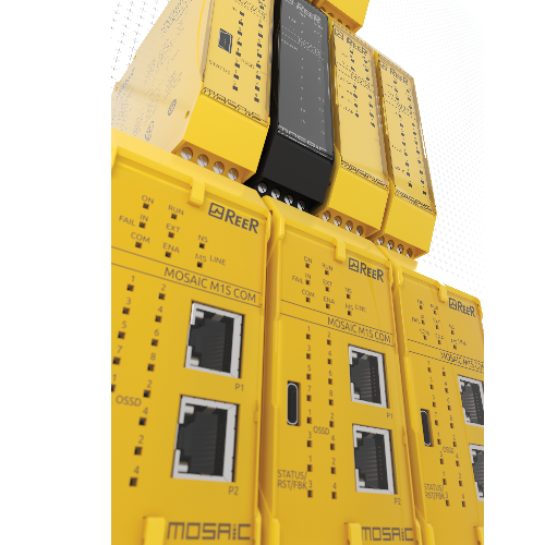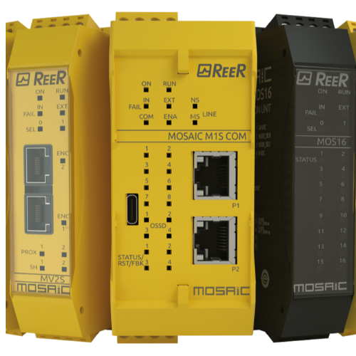 Les contrôleurs de sécurité MOSAIC (Modular Safety Integrated Controller) de ReeR Safety sont des solutions compactes, modulaires et puissantes, conçues pour gérer et surveiller efficacement la sécurité des machines et des systèmes industriels. Ces dispositifs innovants simplifient la mise en œuvre des fonctions de sécurité dans les environnements complexes, tout en assurant une conformité stricte avec les normes internationales (EN ISO 13849-1, EN 62061, et IEC 61508).